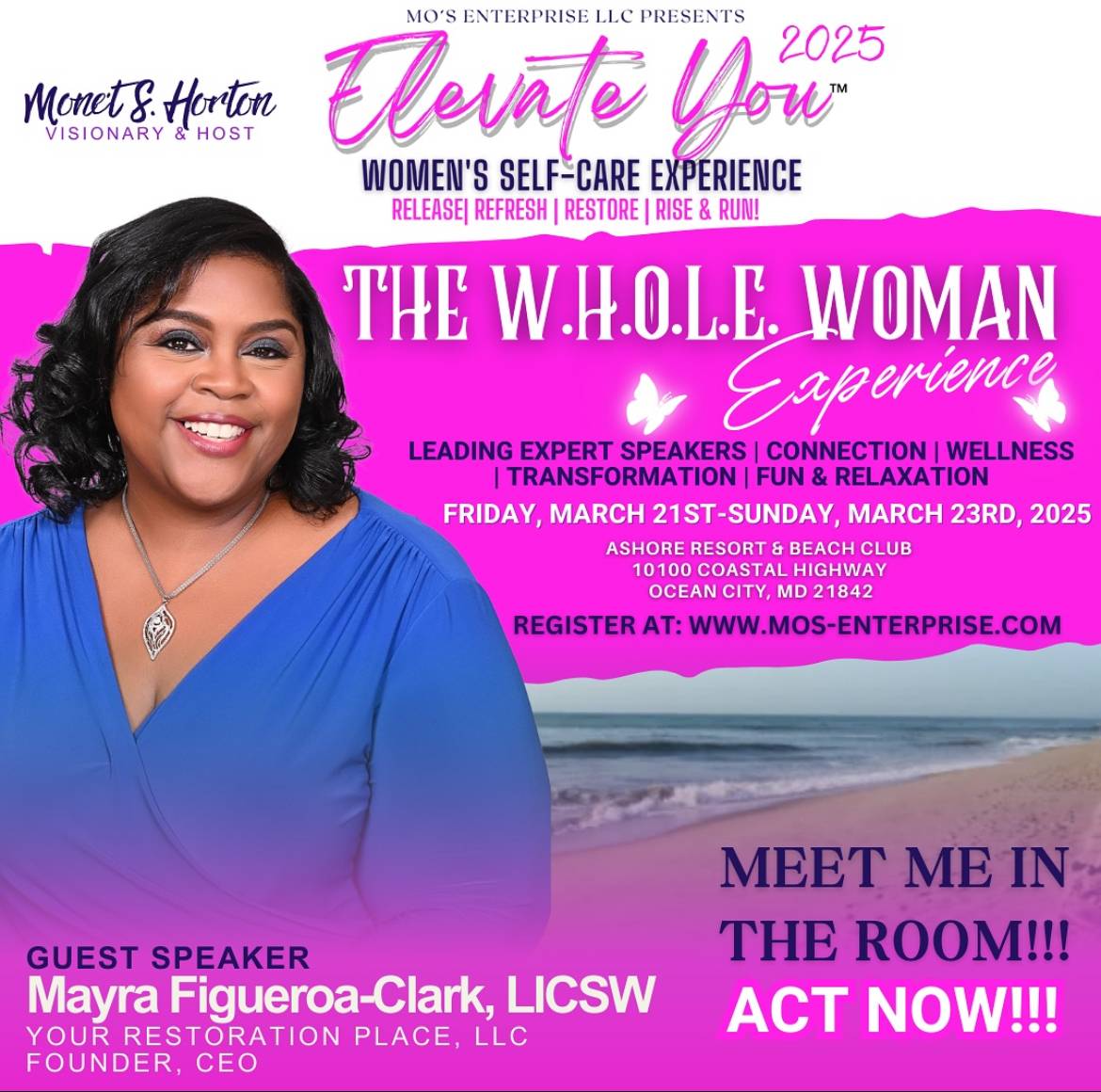 I invite you to join me at an empowering and life-changing event—Elevate You 2025: The W.H.O.L.E. Woman Experience happening from March 21st to March 23rd at the Ashore Resort & Beach Club in Ocean City, MD.